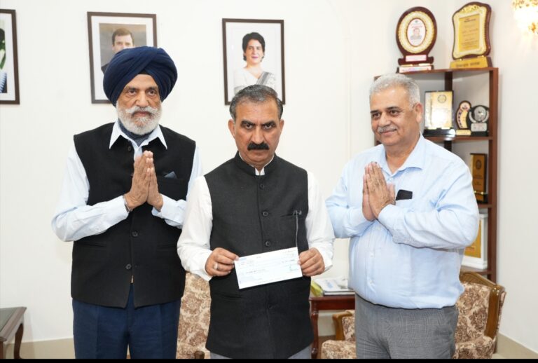 AVM (Retd.) D.S. Guram and Zonal Secretary Sunil Talwar presented a cheque of rupees two crore to Chief Minister Thakur...