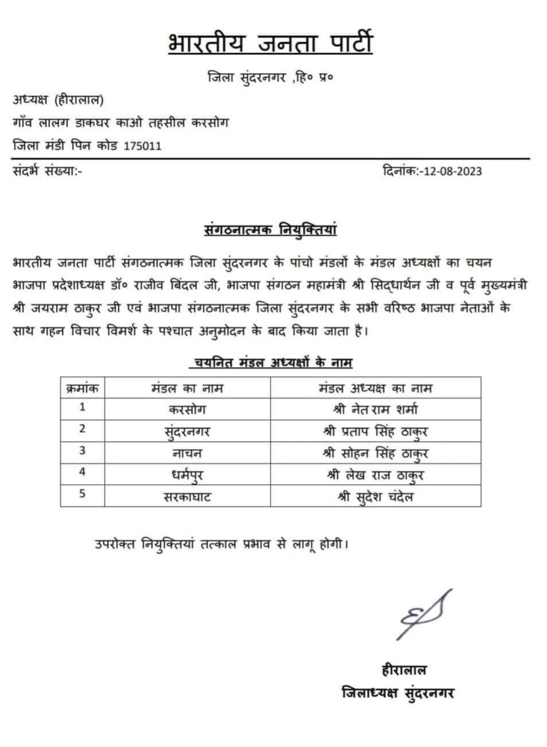 भारतीय जनता पार्टी संगठनात्मक ज़िला सुन्दर नगर के जिला अध्यक्ष श्री हीरा लाल जी ने भाजपा प्रदेश अध्यक्ष श्री राजीव...