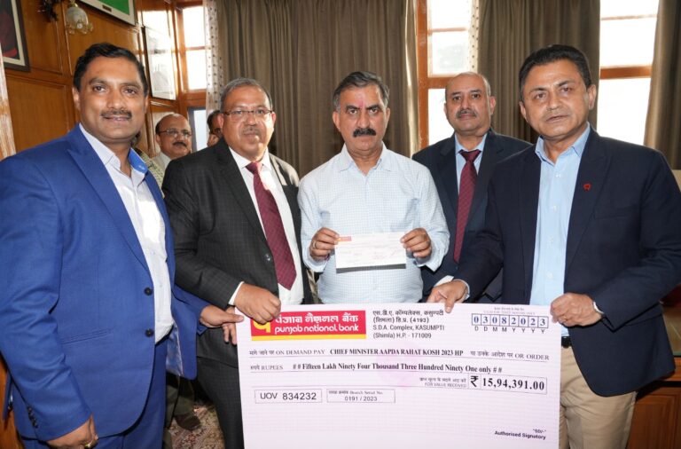 Naresh Kumar Garg GM & Zonal head Shimla PNB Bank presented a Cheque of Rupees Fifteen Lakh Ninety four thousand...