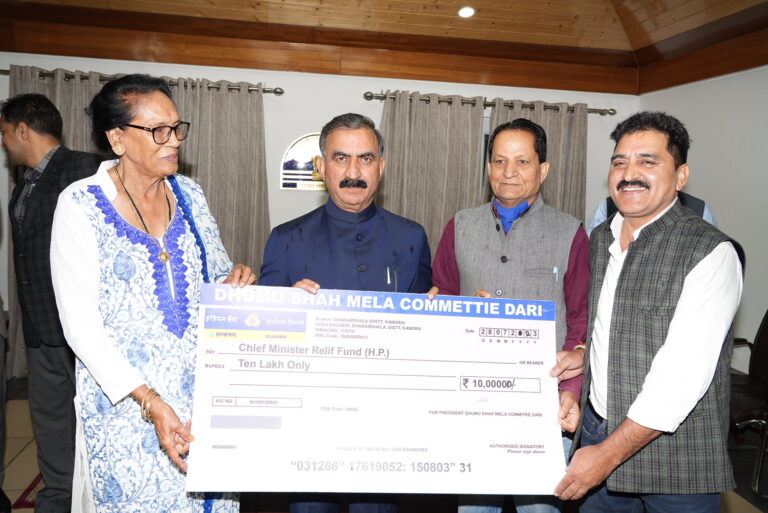 Dhumu Shah Mela Committee Dari presented a cheque of Rs. 10 lakh to Chief Minister Thakur Sukhvinder Singh Sukhu towards...