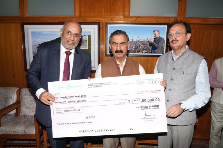 A cheque of Rupees Eleven Lakh was presented to Chief Minister Thakur Sukhvinder Singh Sukhu by the Indo farm equipment...