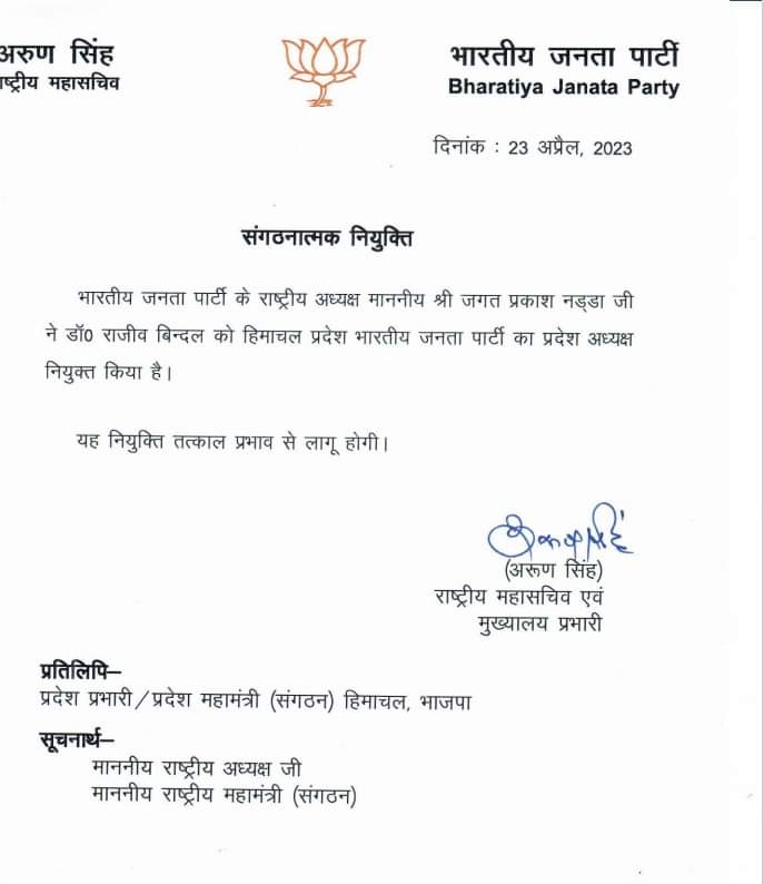 सिद्धार्थन को हिमाचल प्रदेश भारतीय जनता पार्टी का प्रदेश महामंत्री किया नियुक्त