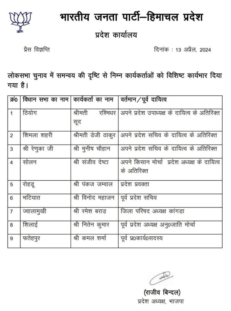 भाजपा ने लोकसभा चुनाव के मद्देनजर इन पदाधिकारियों को दिया ये अतिरिक्त दायित्व