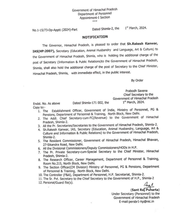 IAS राकेश कंवर होंगे भरत खेड़ा की जगह CM सुक्खू के सचिव