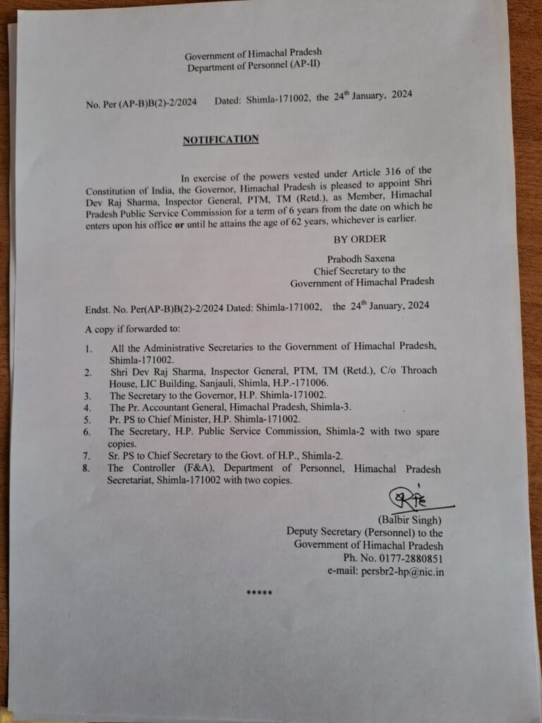 हिमाचल प्रदेश सरकार ने सेवानिवृत्त आईजी पीटीएम, टीएम देवराज शर्मा को राज्य लोकसेवा आयोग में सदस्य नियुक्त किया है। कार्मिक...