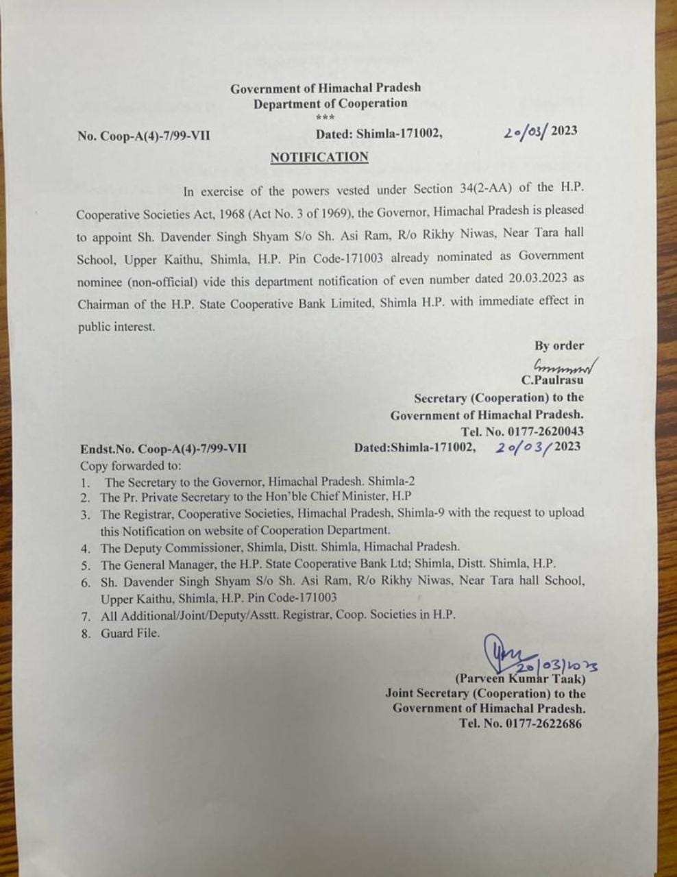 Himachal Shimla Davender Singh Shyam Appointed Chairman of H.P. State Cooperative Bank Limited 1 min read 3 years ago Shimla, March 20 Tags: #Himachal News# #HimachalPolitics #Politics #sukhu Chairman of the H.P. State Cooperative Bank Limited. Development Environment Government of Himachal himachal Himachal News Himachal Pradesh HP news News Himachal Shimla Continue Reading Previous Er. Vikas Sood, Superintending Engineer HPPWD Promoted As Chief EngineerNext 3-day flower fest concludes successfully at Shoolini Univ