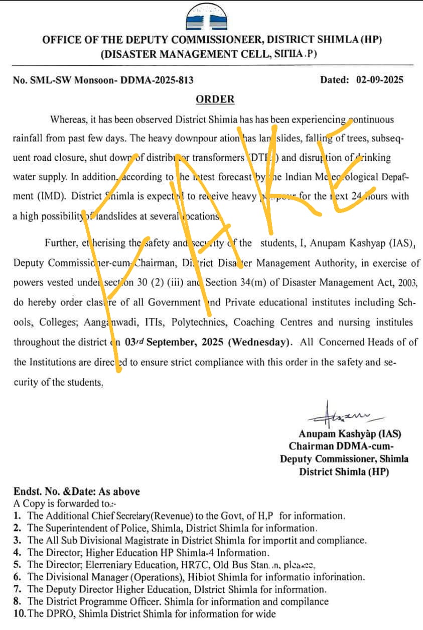 Shimla, Sept 2 – Authorities have clarified that the viral notification regarding a holiday in Shimla district is fake. Officials confirmed that an FIR will be registered in the matter. People have been urged not to share or circulate the false notification.