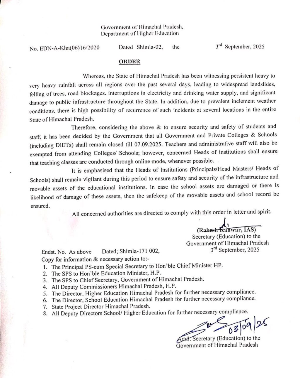 Shimla, September 3 – The Himachal Pradesh Government has ordered the closure of all Government and Private Schools, Colleges, and DIETs across the state till September 7, 2025, in view of continuous heavy rainfall, landslides, road blockages, and damage to public infrastructure.