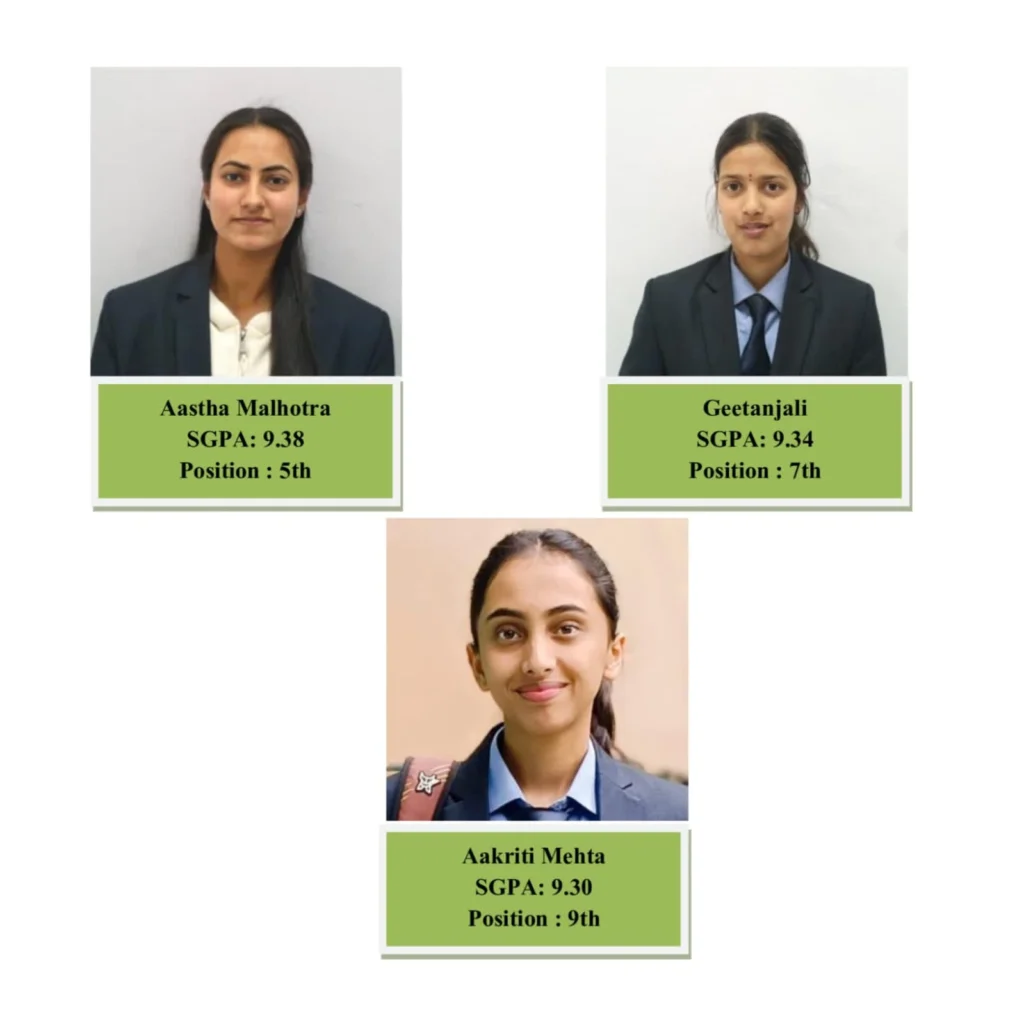 Astha Malhotra secured 5th position with an SGPA of 9.38, followed by Geetanjali at 7th position (9.34 SGPA) and Aakriti Mehta at 9th position (9.30 SGPA). Notably, girl students led the achievement with outstanding results.