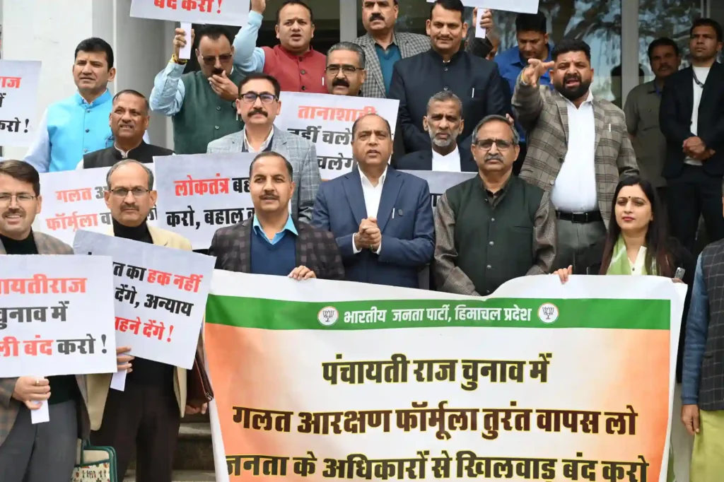 The BJP legislative assembly members , led by Leader of Opposition Jairam Thakur, staged a strong protest outside the Himachal Pradesh Assembly over changes in the पंचायत चुनाव reservation roster, alleging misuse of power by the state government.