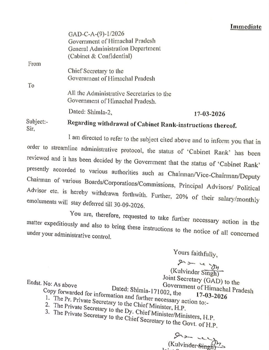 A spokesperson of the State Government today here informed that the Government of Himachal Pradesh has decided to withdraw the status of ‘Cabinet Rank’ presently accorded to various authorities, including Chairman, Vice-Chairman, Deputy Chairman of Boards, Corporations and Commissions, as well as Principal Advisors and Political Advisors.