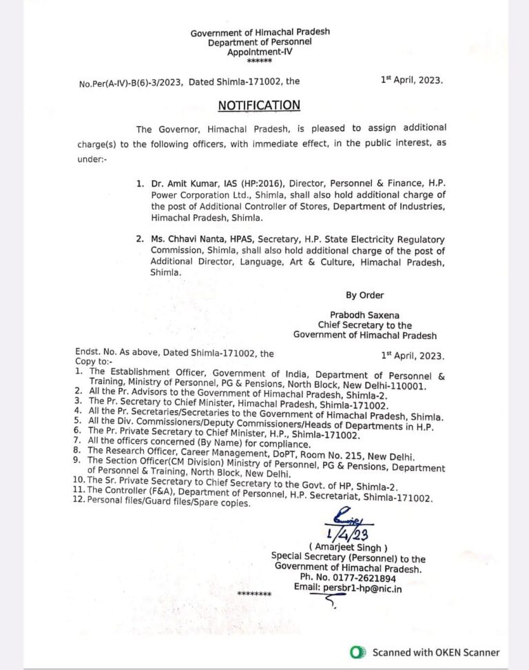 Shimla, April 01 Dr. Amit Kumar, IAS (HP:2016), Director, Personnel & Finance, H.P. Power Corporation Ltd., Shimla, shall also hold...