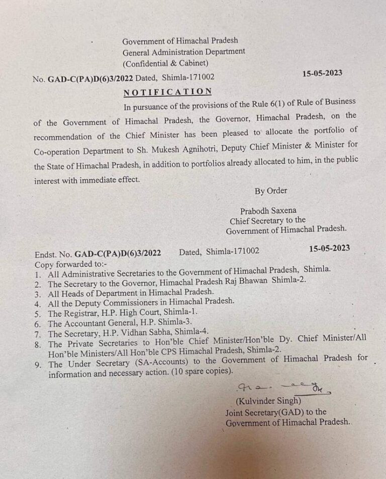 उप मुख्यमंत्री मुकेश अग्निहोत्री को मिली एक और विभाग की जिम्मेदारी , संभालेंगे को-ऑपरेटिव डिपार्टमेंट