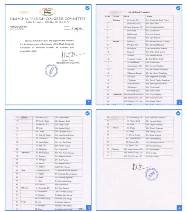 Shimla, April 17: Himachal Pradesh Congress President Vinay Kumar has appointed new Block Presidents of the Congress Committee. The notification...